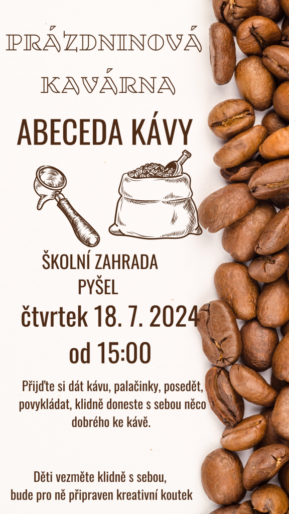 Prázdninové čtvrteční odpoledne si můžete zpříjemnit šálkem dobré kávy nebo jiného nápoje na školní zahradě v Pyšele. Jako bonus si tentokrát můžete dát i palačinky na různý způsob. Budeme rádi, když s sebou donesete něco dobrého na stůl ke kávě. Do této kavárny můžete s sebou vzít i děti, bude pro ně připraven kreativní koutek.